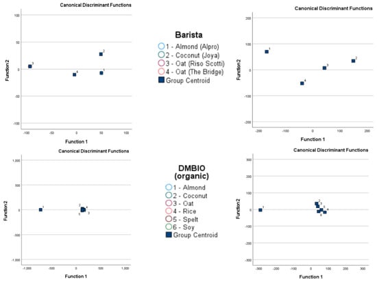 When assessing barista samples, the GC-IMS approach was able to separate almond-based samples from one of two oat-based samples, but no complete separation was possible when comparing all barista samples using this approach. By contrast, the electronic nose approach was able to completely separate coconut-based samples from all other barista samples, but overlaps occurred between almond-based samples and the two oat-based samples.