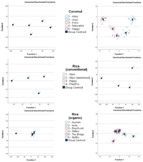 Samples were compared across brands (Alpro: almond, cashew, rice, and sugar-free soy; DMbio: almond, coconut, oat, rice, soy, and spelt), type (barista: almond, coconut, and oat), and plant source (almond: roasted, barista, conventional and organic; coconut: Adez, Joya, Koko, Naturaktiv, and Happy; conventional rice: Alpro traditional, Alpro sweetened, PlantPro, and Happy; organic rice: Auchan, Isola, Riso Scotti, DMbio, The Bridge, and MyBio).