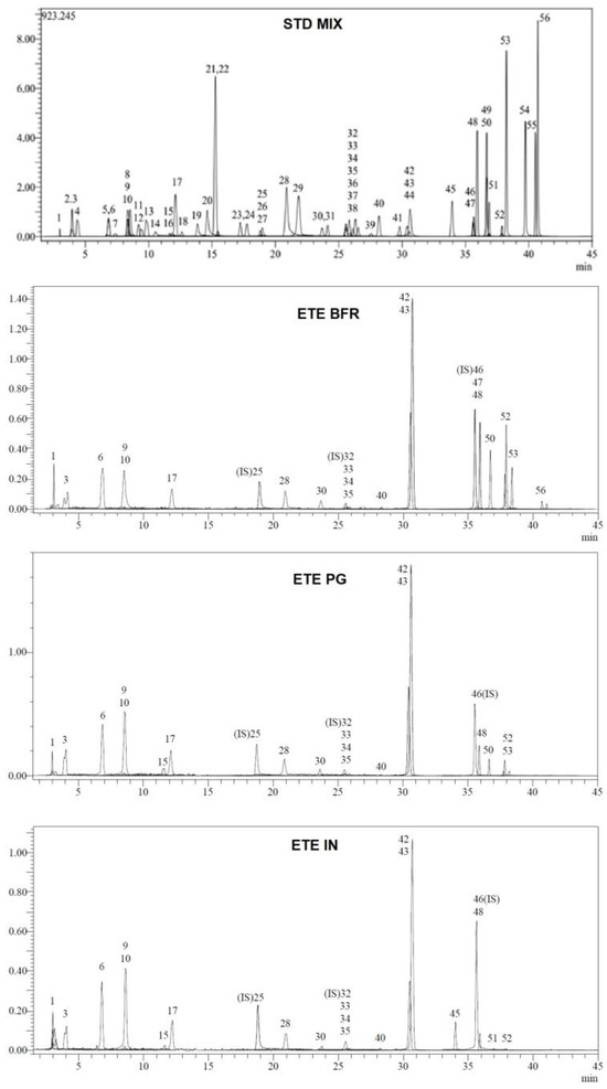 LC/MS/MS chromatogram of the samples and the mixture of standards.