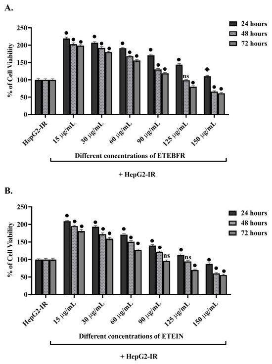 Determination of non-toxic concentrations of ETEBFR and ETEIN extracts in insulin-resistant HepG2 (HepG2-IR) cells by WST-1. (A) The % value of cell viability with increasing concentrations of ETEBFR applied to HepG2-IR cells for 24, 48, and 72 h. (B) The % value of cell viability with increasing concentrations of ETEIN applied to HepG2-IR cells for 24, 48, and 72 h. HepG2-IR cells were used as the control cell group and analyzed using 2-way ANOVA with multiple comparisons in the GraphPad Prism program. ● Statistically significant value at p ≤ 0.0001; ♦ statistically significant at p ≤ 0.001. ns = statistically similar results (not significant).