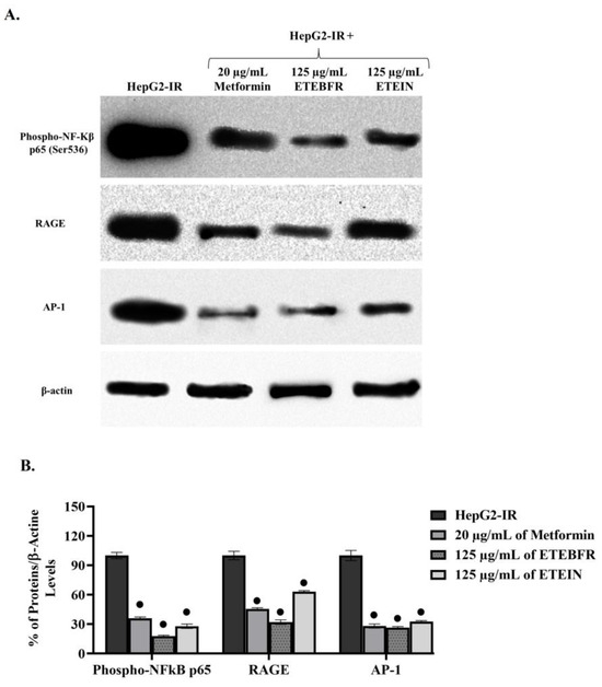 Detection of the changing protein levels in the molecular mechanism following the application of ETEBFR and ETEIN extracts at a non-toxic concentration of 125 µg/mL to HepG2-IR cells by Western blot. (A) Membrane image showing expression of phospho-NfκB, RAGE, and AP-1 proteins in the cellular pathway of HepG2-IR cells treated with 20 µg/mL of metformin (positive control), 125 µg/mL of ETEBFR, and 125 µg/mL of ETEIN extracts. (B) Statistical analysis of each protein compared to beta-actin, which has its own loading control. ● Significant at p ≤ 0.0001.