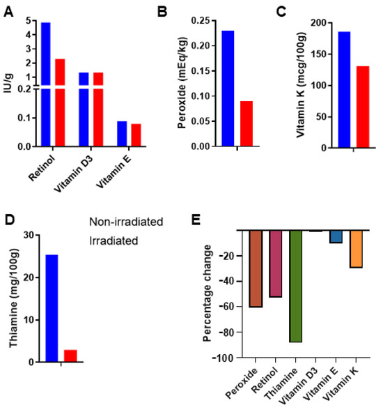 Nutrient and lipid oxidation analysis of NuRFBs in irradiated (red) and non-irradiated (blue) samples. Histogram represents fat-soluble vitamins retinol, D3, and E (A); peroxide (B); vitamin K1 (C); and thiamine (D) levels in the NuRFBs. (E) Bar graph showing the % loss of nutrients in irradiated NuRFBs. n = 1 for all tested nutrients.