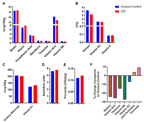 Rodent Research 5 (RR-5) mission NuRFB nutrient analysis. Histogram represents water-soluble vitamins (A); fat-soluble vitamins retinol and vitamins D3 and E (B); choline bitartrate and vitamin K1 (C); p-anisidine (D); and peroxide (E) levels in the NuRFBs. (F) Bar graph showing the % loss of nutrients in NuRFBs sent to the ISS compared to the ground controls. n = 1 for all tested nutrients.