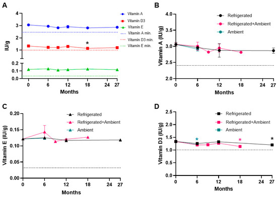 Fat-soluble vitamin levels in NuRFBs. (A) Vitamin A and E levels did not show any significant changes over 27 months in comparison to the baseline at 0 months, while a subtle yet significant loss of vitamin D3 levels was observed at the 18 (p = 0.0047, black *) time points. No significant changes were observed in the levels of vitamin A (B) and E (C) in the refrigerated, ambient, and refrigerated + ambient storage conditions compared to the baseline values. Vitamin D3 (D) levels were decreased in ambient storage at 6 months (p = 0.0119, teal *), and in refrigerated + ambient storage at the 18-month (p = 0.0134, pink *), and refrigerated storage at the 27-month (p = 0.037, black *) time points compared to the baseline. The dotted line corresponds to NRC minimum requirements.