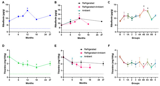 Water-soluble vitamin levels across time and different treatment groups. (A) An increasing trend was noted in riboflavin with a significant increase at the 12-month time point (p = 0.003, blue *). (B) Riboflavin levels were significantly increased at the 6-month time point in ambient (p = 0.0238, teal *) and at the 12-month point in refrigerated (p = 0.0066, black *) and refrigerated + ambient (p = 0.0055, pink *) storage conditions. (C) Different groups exhibited increasing levels of riboflavin with significant increases in groups 4B (6 months refrigeration followed by 6 months at ambient temperature, p = 0.0026, black *) and 5A (12-month refrigeration, p = 0.0063, black *) compared to the baseline-B. (D) A decreasing trend was noted in thiamine levels with significant decreases at 12-month (p = 0.047, green *) and 18-month (0.0058, green *) time points. (E) Thiamine levels were significantly decreased in ambient storage at the 6-month time point (p = 0.0238, teal *), as well as in refrigerated + ambient storage at 12 months (p = 0.0245, pink *) and 18 months (p = 0.0245, pink *) time points. (F) Different groups exhibited decreasing trends in thiamine levels with significant decreases in groups 4B (6 months refrigeration followed by 6 months at ambient temperature, p = 0.0089, black *) and 5B (12 months refrigeration followed by 6 months at ambient temperature, p = 0.0105, black *) compared to the baseline. The dotted line corresponds to the NRC minimum requirements for the respective vitamins.