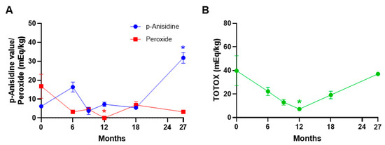 Lipid oxidation in NuRFBs. (A) Non-significant fluctuations in p-anisidine values were noted except at 27 months (p = 0.05) compared to baseline at 0 months, whereas the peroxide levels showed a decreasing trend with a significant decrease at 12 months (p = 0.0003). Red * represents statistical significance for peroxide levels, and blue * represents statistical significance for p-anisidine levels. (B) Reduction in total oxidation levels was observed over time with a significant decrease noted at the 12-month (p = 0.0079, green *) time point. * p ≤ 0.05.