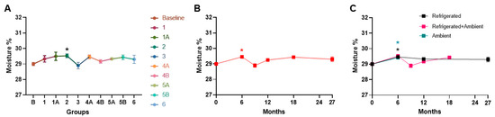 Moisture levels in NuRFBs. (A) Subtle fluctuations in moisture content were seen across groups with a significant increase in group 2 (3 months refrigeration followed by 3 months in ambient storage, p = 0.0427). Statistical significance for moisture is indicated by * (B) Similar fluctuations were observed in moisture levels over time with a significant increase at the 6-month time point (p = 0.0142), denoted by the red *. (C) Moisture levels were significantly increased at the 6-month time point in ambient (teal *, p = 0.0476), and refrigerated (black *, p = 0.0251) storage conditions compared to baseline.