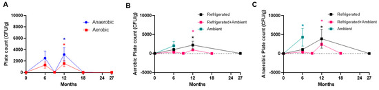 Microbial plate counts in NuRFBs. (A) Significant increase in aerobic (p = 0.0235) and anaerobic (p = 0.0107) plate counts were noted at 12 months compared to baseline at 0 months. Red * represents statistical significance for aerobic plate count, and blue * represents statistical significance for anaerobic plate count. (B) Aerobic plate counts were significantly increased at the 12-month point in refrigerated (p = 0.0437, black *) and refrigerated + ambient (p = 0.0440, pink *) storage conditions. (C) Anaerobic plate counts were significantly increased at the 6-month time point in ambient (p = 0.0238, teal *) and at the 12-month point in refrigerated (p = 0.0397, black *) and refrigerated + ambient (p = 0.0156, pink *) storage conditions.