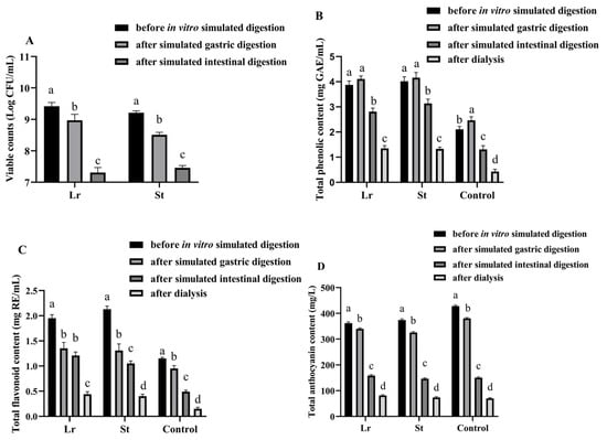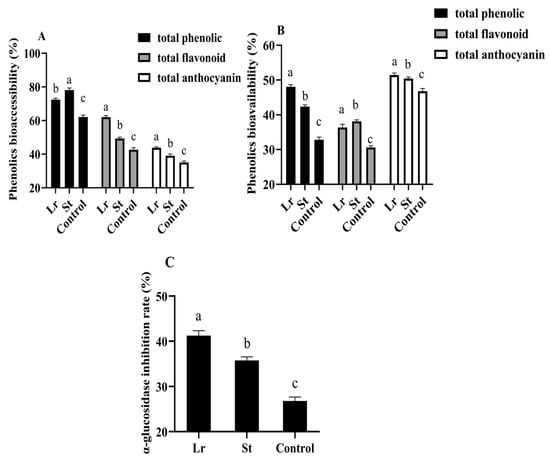 In this study, phenols bioaccessibility and phenols bioavailability in PSPJ were evaluated by measuring the changes in TPC, TFC, and TAC during the in vitro simulated digestion process. As shown in Figure 4, the total phenolic bioaccessibility increased from 62.09% to 72.42% and 78.11% in the Lr group and St group, respectively. The bioaccessibility of total flavonoid and total anthocyanin also increased. The decrease in pH during fermentation enhanced the stability of phenols, thereby increasing their bioaccessibility [33,34]. However, the total phenolic bioavailability increased by 15.22% and 9.54% in the Lr and St groups, respectively. It was previously reported that LAB fermentation could degrade phenolic substances of blueberry puree into more easily absorbed forms, thereby improving their bioavailability [4].