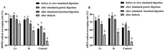 The DPPH radical scavenging rate in the Lr and St groups increased from 81.53% and 79.35% to 87.19% and 81.21% after SGD and decreased from 87.19% and 81.21% to 80.02% and 71.31% after SID, respectively, during in vitro simulated digestion. In addition, the ABTS radical scavenging rate showed a similar trend. During the SGD, some bound polyphenols were released, thereby improving the antioxidant capacities [24]. However, during the SID, the decrease in antioxidant activities might be due to the increase in pH and degradation of phenols by digestive enzymes [31].