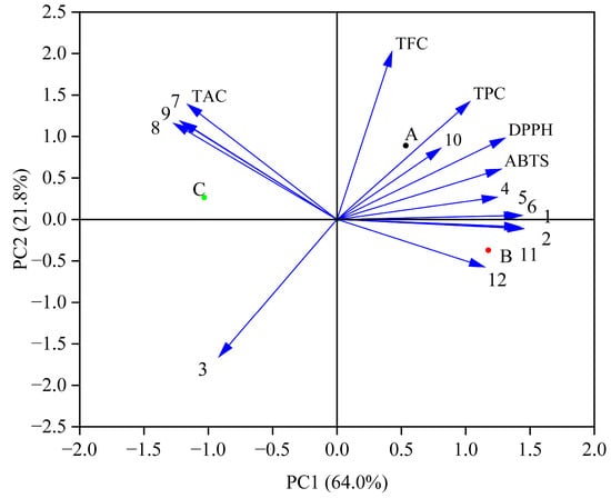 PCA of the antioxidant activities and phenolic profiles during in vitro simulated digestion. (A—the Group fermented by Lr, B—the Group fermented by St, C—the Control group; 1—Gallic acid, 2—Vanillic acid, 3—Syringic acid, 4—Protocatechuic acid, 5—Ferulic acid, 6—Caffeic acid, 7—Chlorogenic acid, 8—Peonidin-3-O-glucoside, 9—Cyanindin-3-O-glucoside, 10—Rutin, 11—Quercetin, 12—Kaempferol).