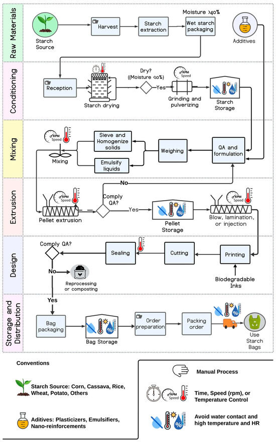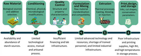 Environmental and economic pressures undoubtedly drive the global transition from petrochemical-based single-use packaging to biodegradable alternatives. Policies such as Directive (EU) 2019/904 aim to reduce single-use plastics by 2026, addressing the 60% of plastic waste these materials contribute in the EU [11]. However, merely implementing regulatory frameworks is insufficient to close the global gap between ambitious environmental goals and practical solutions. Although plastic recycling plays a crucial role in waste management, there are notable disparities in recycling capacities between developed and developing countries. For instance, while regions like North America, Europe, and China recycled approximately 33 million tons of plastic waste in 2019, Latin America and Africa recycled only 5.5 million tons, highlighting the need for alternative strategies better suited to these contexts [12]. It is suggested that for developing countries, it will be more feasible, practical, and cheaper to produce bio-packages to replace plastics than develop recycling infrastructure in regions with low recycling education, difficult road access, low industrial development, poor urban infrastructure, and poor selective waste collection [13,14]. Furthermore, many biodegradable materials available on the global market, such as PLA and PBAT or even biomaterials made from modified starches, are rarely accessible to developing countries due to high import costs and tariffs, which make them uncompetitive in local markets. This creates a significant barrier to their widespread use in these regions. The production of flexible starch-based packaging involves multiple stages, including raw material obtainment, conditioning, characterization, formulation, extrusion, molding, printing, packaging, and storage, each tailored to address specific challenges (Figure 1).