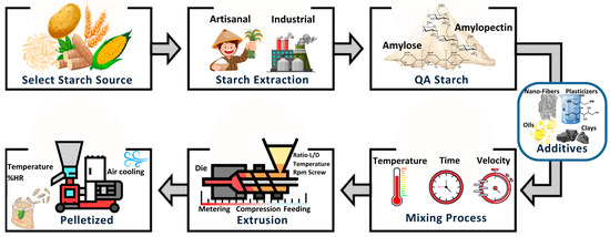 Figure 2 summarizes the sequential steps in transforming raw materials into pellets, highlighting the close relationship between mixing and extrusion techniques and the resulting starch-based bioplastic product.