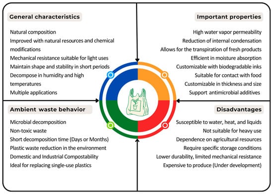 Migration tests have become relevant for food packaging. This test evaluates the transfer of substances from the bags to the food in contact with them [161]. Analytical techniques are used to detect and quantify the migration of potentially hazardous compounds, such as additives and contaminants that may be contained in the bags [162]. In starch-based bags, the highest migration occurs from glycerol, sorbitol, or similar compounds [163,164,165]. Other tests analyze tear resistance, impact resistance, puncture resistance, dimensional stability, and moisture content, depending on specific application requirements and quality standards. Figure 3 summarizes the relevant and expected characteristics, properties, and disadvantages of starch-based bags.
