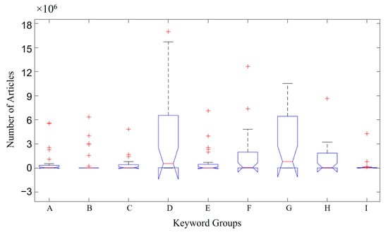 Figure 3 shows the list of articles for each language searched, considering all the groups of keywords (A–I) in Figure 1 and the databases in Figure 2. The majority of the articles were published in English, totaling ~10 × 106 available articles. In this case, the median was not as convincing in differentiating the data due to the discrepant volume of articles in English compared to Spanish and Portuguese. However, the boxplot technique still allowed for this relevant differentiation when observing the axis of the article number. Portuguese was the second-highest-ranking language for the number of articles, totaling ~0.1 × 106 available articles. The smallest number of articles found was in Spanish, totaling a value of ≤0.05 × 106 available articles.