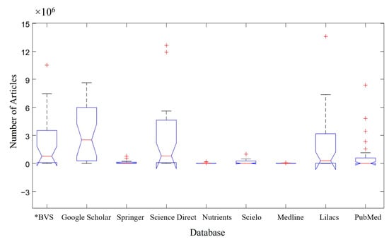 Figure 2 shows the list of articles by each database. Google Scholar emerged as the database with the highest number of articles available when the keyword searches for all the groups (A–I) in Figure 1 were analyzed, containing ~6 × 106 available articles. This can be seen in the median representation of Google Scholar (Figure 2), which visually demonstrates a much larger volume of papers than those of the other groups. The boxplot technique allows for these analyses, even when the differentiation with the Science Direct database is not as relevant in visual terms. This was followed by the Science Direct database, containing ~5 × 106 available articles, and the BVS—Virtual Health Library and Lilacs databases, both containing ~4 × 106 available articles. By contrast, Nutrients and Medline were the databases with the fewest published articles (≤0.1 × 106 articles). The notch of the “Google Scholar” does not intercept the notch of the other databases searched; therefore, the median of the Google Scholar database is different from the other databases with 95% certainty.