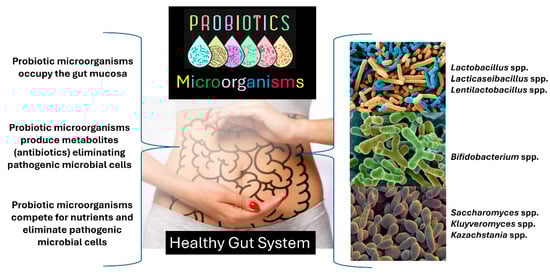 In general, probiotic microorganisms, such as Lactobacillus spp., Bifidobacterium spp., Lacticaseibacillus spp., Lentilactobacillus spp., Bifidobacterium spp., Kluyveromyces spp., Kazachstania spp., and Saccharomyces spp., act by inhibiting pathogens’ intestinal colonization and combat undesirable and opportunistic microorganisms [3,6,16,25,26,30,31,32,33]. Figure 4 summarizes the action of probiotic microorganisms in the gut as natural biotherapeutics. Ingesting probiotics can help the gut function properly. Probiotic dietary supplements are ideal when they have 1 billion Colony Forming Units (CFUs)/Dose [3,6,16,25,26,30,31,32,33].