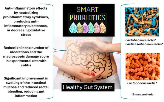 Molecular biology and genetic engineering enable the development of sophisticated systems to produce genetically engineered probiotic microorganisms or smart probiotics [22,34,74,75,76,77,78,79,80,82]. These advanced probiotic strains show great promise for combating intestinal inflammatory points and delivering therapeutic molecules/metabolites [22,34].