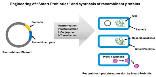 Engineering smart probiotics and synthesis of recombinant proteins. Figure created by the authors according to scientific literature [76,77,78,80,81,82].