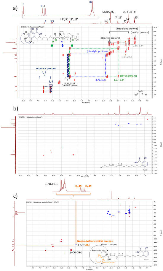 Analysis of anacardic acids via NMR: (a) 2D 1H-1H COSY contour map of AAn2, (b) 2D 1H-13C HSQC contour map of AAn2, and (c) 2D 1H-13C HSQC contour map of the anacardic acid mixture (mix: AAn1 + AAn2 + AAn3), presents the antiphase relationship between the =CH2 and –CH2– groups (blue) and the -CH-/-CH3 groups (red).