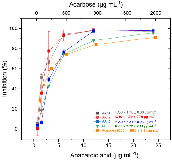 All the samples demonstrated a profile in which enzyme inhibition increased with the increasing concentration of the tested compounds. The monoene AAn1 had the greatest inhibitory effect, presenting an IC50 value of 1.78 ± 0.08 μg mL−1 (5.1 ± 0.2 μM), followed by the diene AAn2 with IC50 = 1.99 ± 0.76 μg mL−1 (5.8 ± 2.2 μM), the triene AAn3 with IC50 = 3.31 ± 0.03 µg mL−1 (9.7 ± 0.1 μM), and the mixture of anacardic acids (mixed sample, IC50 = 3.72 ± 2.11 µg mL−1). These findings highlighted the superior α-glucosidase inhibitory effectiveness of anacardic acids compared with that of acarbose with IC50 = 169.3 ± 8.91 µg mL−1 (262.2 ± 13.8 μM). These results aligned with the data obtained by Hu et al. [23], who isolated derivatives of anacardic acid (2-[(Z)-nonadec-14-enyl]-6-hydroxybenzoic acid) from the leaves of Syzygium samarangense. These compounds significantly inhibited α-glucosidase. The range of IC50 values reported by the authors varied from 0.75 to 3.60 μM.