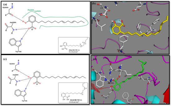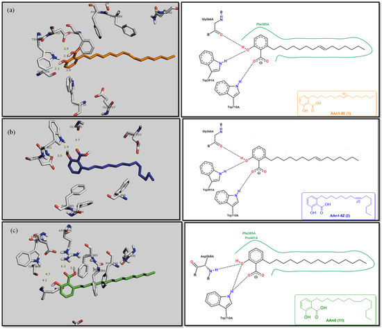 Initially, the comparison between AAn0 (Figure 3c, −8.6 kcal mol−1) and AAn1-E (Figure 3a, −9.9 kcal mol−1) indicated that the presence of a covalent C=C bond in the aliphatic chain may be associated with increased inhibitory activity. However, the binding affinity of AAn1-Z (Figure 3a, −8.9 kcal mol−1) was comparable to that of AAn0 (−8.6 kcal mol−1). This finding suggested that while the presence of a double bond may increase biological activity, this increase was also influenced by its stereochemistry.