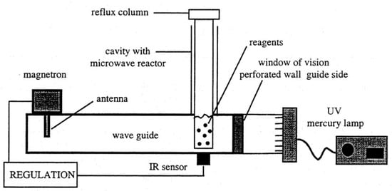 The early combined applications of MW and UV are in the form of separate or combined use of two technologies. As shown in Figure 1, this microwave-UV reactor combines MW and UV technologies for organic synthesis and degradation reactions [25]. The operating principle relies on the selective heating of MW and the electronic excitation effect of UV light to provide a highly reactive environment and accelerate chemical reactions. The equipment is shielded by a specially designed microwave shielding window, which allows the equipment to independently evaluate the effects of MW and UV light while the reaction is being carried out. The rearrangement of o-benzoyloxyacetophenone and the degradation of humic acid in aqueous solution was experimentally confirmed to be enhanced via the combination of MW and UV.