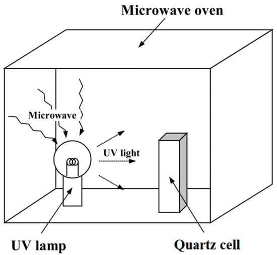 Early MWUV reactors were mainly microwave oven reactors [34,35]. The reaction device is a simple combination of a microwave and an induction UV lamp placed inside a microwave oven, as shown in Figure 2 [26]. The device usually consists of a microwave source (e.g., a domestic microwave oven), an induction UV lamp, and a reaction chamber. The microwave oven provides microwave energy to excite an inert gas such as mercury or argon in the induction UV lamp to produce high-energy UV light for photocatalytic or disinfection reactions [36].
