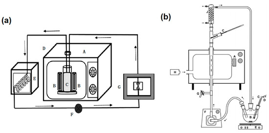 (a) Continuous-flow milk sterilization reactor: (A) microwave oven; (B) electrodeless UV lamp; (C) reactor; (D) Teflon pipes; (E) cooling chamber; (F) sample collector; (G) peristaltic pump [27]. (b) Continuous-flow photocatalytic degradation reactor: (A) modified microwave oven with magnetron; (B) glass reservoir with magnetic stir bar; (C) thermometer; (D) chloride ion-selective electrode and/or tube for air bubbling; (E) magnetic stirrer; (F) PTFE diaphragm pump; (G) outlet; (H) spectrometer with a fiber-optic probe; (I) glass tube with titania-coated EDLs; (J) cooling condenser. (Arrows indicate the flow direction) [38].