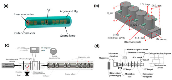 A thin slot is added to the waveguide’s sidewall to create the waveguide slot radiator. It has strong construction, high power-bearing capacity, low loss, and steady performance [31]. The coaxially driven MWUV reactor, developed based on the mentioned slots, has two main structures. One is a cylindrical slot waveguide structure [31,40], as shown in Figure 4a. Several slots around the cylindrical slot waveguide structure are jacketed with a quartz tube. The quartz tube, usually filled with argon and Hg, is shielded from electromagnetic waves via a metal mesh. To excite the plasma lamp, the slots in the coaxial waveguide facilitate the coupling of electromagnetic waves, and the corresponding reactor is shown in Figure 4c. The other one is the rectangular slot waveguide structure [41], as shown in Figure 4b. Several slots are cut in the metal rectangular waveguide, and a metal cavity with a UV lamp is added to each slot. The slots of the rectangular waveguide enable the electromagnetic waves to couple into the metal cylindrical cavity, exciting the plasma lamp. Figure 4d shows the overall diagram of the experimental system.