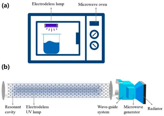 There are two main types of MDEL: microwave-oven-type electrodeless lamp (MOTEL) and resonant cavity electrodeless lamp (RCEL) [28]. As shown in Figure 5a, MOTEL mainly puts the electrodeless ultraviolet lamp in the microwave oven; the gas inside the UV lamp receives microwave excitation, which will produce UV light. This type of UV lamp mainly uses microwave and UV synergistic effects [47]. MOTEL is simple and easy to operate, but it is not conducive to separating UV and microwave, and so the two physical fields often coexist. As shown in Figure 5b, the structure of the RCEL is a unique microwave generator that continuously and steadily transmits microwaves to a resonant cavity through a microwave waveguide system. The cavity is a well-designed mesh structure, which confines the microwaves inside and facilitates the reaction with the electrodeless lamp to produce UV [31]. This type of UV lamp can realize the separation of microwave and UV, and at the same time, it is convenient to regulate the process parameters of the equipment.