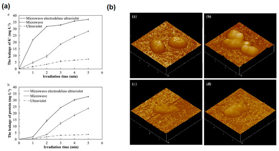 (a) Leakage of E. coli under different treatments: a. K+ leakage, b. protein leakage. (b) AFM images of E. coli: a. normal E. coli, b. UV treatment for 3 min, c. microwave treatment for 1 min, and d. MWUV treatment for 1 min [63].
