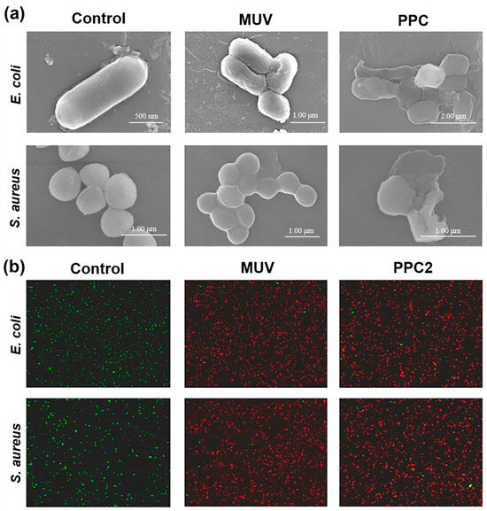 (a) Bacterial morphological changes; (b) bacterial staining for live and dead [65].