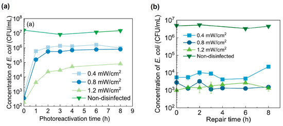 (a) E. coli changes over photoreactivation time; (b) E. coli changes over dark treatment time [42].
