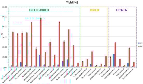 The aim of the research was to compare the efficiency of extracting bioactive compounds from various forms of plant raw material (dried, lyophilized, and frozen material) using complementary techniques: supercritical fluid extraction (SFE) and accelerated solvent extraction (ASE). The raw materials (sea buckthorn, chokeberry, black elderberry, rowan, wild blueberry, and wild rose) were selected based on ethnopharmacological premises, which contribute to the development of innovative food products falling into the category of functional food.