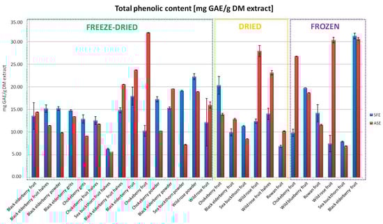 The ASE method showed higher phenolic content values in most of the analyzed samples. The highest values were recorded for extracts from freeze-dried chokeberries (31.95 mg GAE/g of dry extract) and frozen fruits from wild rose (30.31 mg GAE/g of dry extract) and black elderberry (30.56 mg GAE/g of dry extract) (Figure 2). In the case of the SFE method, the highest phenolic values were obtained for frozen black elderberry fruits (31.23 mg GAE/g of dry extract) and freeze-dried powder from wild rose (22.25 mg GAE/g of dry extract) (Figure 2). To provide additional context, our findings were compared to the study by Patra et al. [17], where ASE achieved a 30–40% higher total phenolic content compared to traditional methods. In our study, the ASE method produced the highest phenolic content (e.g., 31.95 mg GAE/g of dry extract for freeze-dried chokeberries), which is approximately 20% higher than the SFE results for the same material. Similarly, the ASE extracts from frozen wild rose fruits (30.31 mg GAE/g) exceeded the phenolic content reported for Soxhlet extraction by Mustafa and Turner [19] by approximately 35%. These comparisons highlight the significant advantages of advanced extraction methods over conventional ones and validate their applicability in producing phenolic-rich extracts for the food industry.