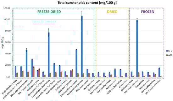 Total carotenoid content in extracts obtained using SFE and ASE calculated per gram of dry mass of the extract.