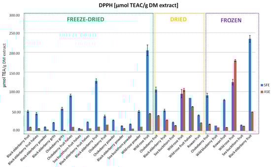 The results of the DPPH test demonstrated varied antioxidant activity depending on the extraction method and type of fruit. The observed fluctuations in antioxidant activity across the 27 samples were analyzed using one-way ANOVA to determine the statistical significance between the two groups (ASE and SFE). It was determined that there were no statistically significant differences between the ASE and SFE methods for the extract from dried wild rose fruit. For all other samples, the differences in antioxidant activity between the two methods were found to be statistically significant. The highest DPPH values were obtained for extracts from frozen black elderberry fruits (234.67 µmol TEAC/g of dry extract) and freeze-dried wild rose powder (205.36 µmol TEAC/g of dry extract) using the SFE method (Figure 4). The ASE method showed lower values in the analyzed samples (Figure 4). These differences may arise from the varying abilities of the extraction methods to preserve and concentrate antioxidants. Antioxidant activity is closely related to the presence of phenols and carotenoids, suggesting that extraction methods should be tailored to specific goals to maximize health benefits. Significant differences in antioxidant potential may also result from the selectivity of the extraction processes. Paes et al. [22] also emphasize that while the SFE method can yield similar amounts of phenolic compounds as ASE, it produces extracts with higher antioxidant activity. The higher selectivity of SFE allows for better preservation of the bioactivity of phenols, which is particularly important given their role as antioxidants. SFE enables precise extraction of low-polarity compounds, which is advantageous for obtaining high-quality extracts. The results obtained may indicate a high level of interfering compounds in ASE extracts that do not exhibit biological activity. Shahid et al. [23] also note that while ASE is more efficient, it may lead to the extraction of interfering compounds that can diminish the quality and stability of final products. In contrast, extracts obtained using SFE, despite lower yields, exhibited high antioxidant potential, indicating greater selectivity of this technique. Therefore, extracts obtained by SFE may be particularly valuable for the food industry. SFE, due to supercritical conditions, allows for selective extraction of lipophilic compounds such as carotenoids, as confirmed by results obtained by Yaqoob et al. [24]. Carotenoids play a crucial role in antioxidant mechanisms, and their effective extraction is essential for achieving high antioxidant activity in industrial extracts. An additional advantage of this method is its ability to perform extraction without the addition of a co-solvent, making the final product ready for direct application in production. In the case of ASE extraction, evaporating the solvent can be problematic, requiring an additional step in the production process that involves investment in appropriate equipment as well as costs related to operation and electricity. In this study, the ASE method demonstrated lower antioxidant activity compared to SFE, which may be associated with the presence of these interfering compounds. These compounds can negatively affect the stability, clarity, and overall quality of extracts, representing a significant limitation of this technique.