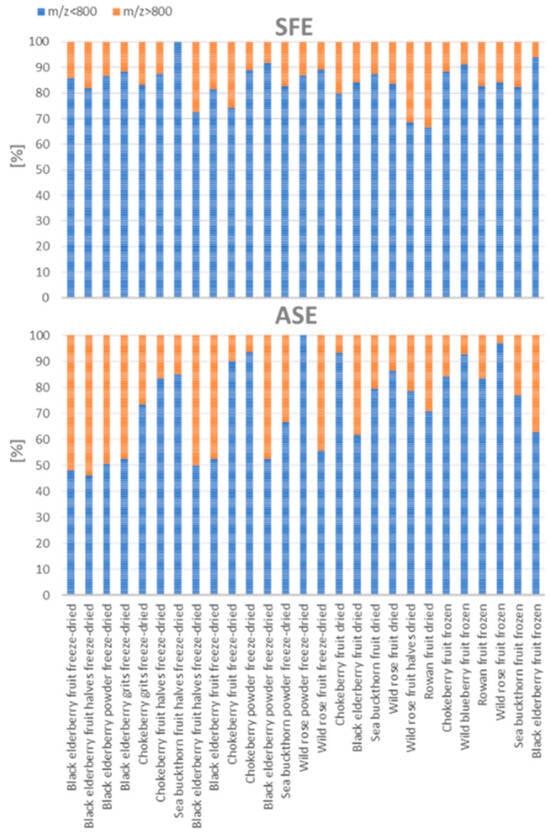 Percentage distribution of m/z values below and above 800 in plant extracts obtained using two extraction methods: accelerated solvent extraction (ASE) and supercritical fluid extraction (SFE).