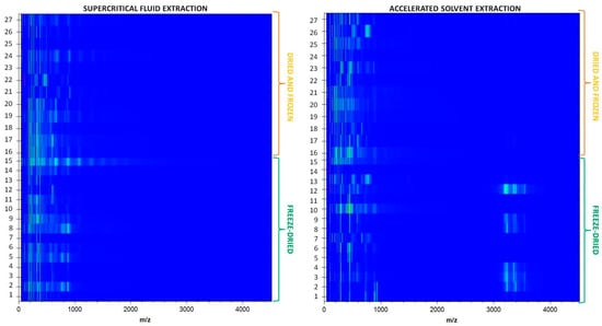 In this study, two extraction techniques—ASE and SFE—were compared in terms of their impact on the mass profile of the analyzed using MALDI-TOF-MS. The results indicate significant differences in the distribution of mass-to-charge ratios (m/z) between the extracts obtained using both methods (Figure 5 and Figure 6).