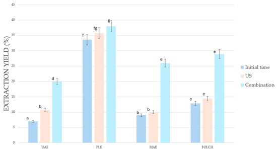 N. gaditana extraction yield obtained using different techniques (UAE, PLE, MAE, and Folch) comparing the initial time with the combined pretreatment and the ultrasounds on their own. Lowercase letters (a–g) indicate significant differences between values within the same column. Different letters denote that the corresponding values are statistically different (p < 0.05, according to the applied multiple comparison test).