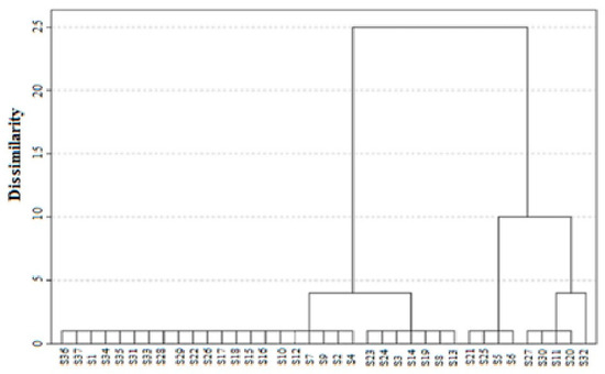 Cluster analysis, based on the interaction between “samples × effect on strains”, classified the NHs into five distinct groups, delimited by a Euclidean distance of 1 (Figure 3). The first group included samples such as S3, S8, S13, S14, S19, S23, and S24, which exhibited antimicrobial activity exclusively against S. aureus (MSSA) ATCC 25923. A second group, comprising S5, S6, S21, and S25, demonstrated effectiveness against both S. aureus strains. The third group, which included S11, S20, S27, and S30, displayed activity against S. aureus (MSSA) ATCC 25923 and P. aeruginosa ATCC 27853. Interestingly, the fourth group, represented solely by S32, was the only honey that acted against all three reference bacteria. The remaining samples formed a fifth group that showed no detectable antimicrobial activity. This analysis highlights the variable effectiveness of NHs based on their interactions with bacterial strains.