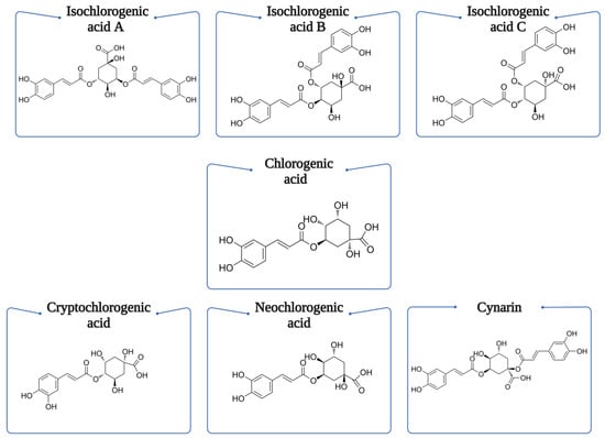 Hydroxycinnamic acids (HCAs) are merely found in their bound forms, rarely in their free one. Caffeic acid is the main compound, representing over 70% of the total hydroxycinnamic acid of most fruits, concentrations that decrease during the ripening. Ferulic acid is abundant in cereal, found in the aleurone layer and pericarp, averaging around 98% of PA [14]. HCAs are absorbed easily by the stomach and small intestine; afterwards, the conjugation process is catalyzed by detoxifying enzymes. Consumption of HCA has been associated with lowering rates of cardiovascular disease, skin cancer, Alzheimer’s disease, and other brain dysfunctions, as well as obesity and diabetes, when in vivo orally administrated to rodents [11,15]. Chlorogenic acids are abundant in fruit and vegetable species. The most representative sources of CGAs are coffee beans, potatoes, eggplants, and sunflower seeds. They exist displayed as four different isomers of caffeoylquinic acid, 1-CQA, 3-CQA, 4-CQA, 5-CQA (Figure 2). Coffee is considered to be the main source with the largest amount of CGAs, their concentration being 6–12%. Their properties were discovered in 1837 in the work conducted by Robiquet and Bourton, but the name “chlorogenic acid” was given by Payen in 1846. Later along the decades, isomers of CGAs were discovered, and given names by the IUPAC commission [16]. Table 1 describes HCA-rich foods and their importance on health management.