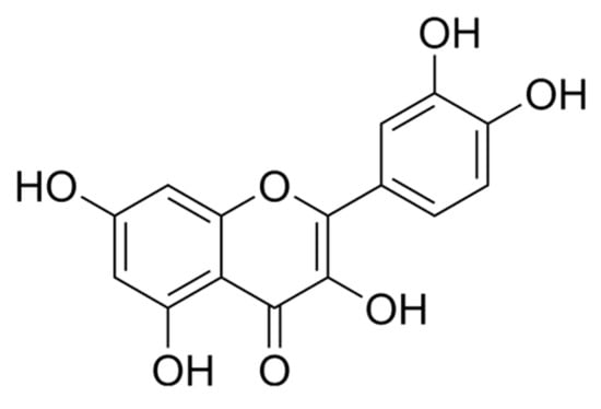 Quercetin and naringenin are two of the most well-researched and potent flavonoids, known for their wide range of health benefits. Quercetin, found in foods like apples, onions, and berries, is celebrated for its powerful antioxidant and anti-inflammatory properties, which help reduce the risk of chronic diseases like heart disease and diabetes [45]. Naringenin, primarily found in citrus fruits such as grapefruit, has similar antioxidant benefits and is also known for its ability to support metabolic health by improving insulin sensitivity and reducing inflammation. The selection of quercetin and naringenin for investigation or inclusion in health interventions is grounded in their substantial therapeutic potential, widespread presence in commonly consumed foods, and their demonstrated capacity to support cardiovascular health, regulate glycemic control, and mitigate oxidative stress. These properties position quercetin and naringenin as significant contributors to preventive healthcare strategies, offering promising avenues for the management of chronic conditions and the enhancement of overall wellness [46]. Quercetin is a flavonol found in more than 20 plant species of fruits, vegetables, or grains, and its chemical structure is presented in Figure 3.