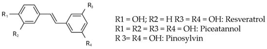 - El Khawand, T.; Courtois, A.; Valls, J.; Richard, T.; Krisa, S. A review of dietary stilbenes: Sources and bioavailability. Phytochem. Rev. 2018, 17, 1007–1029. [Google Scholar] [CrossRef]