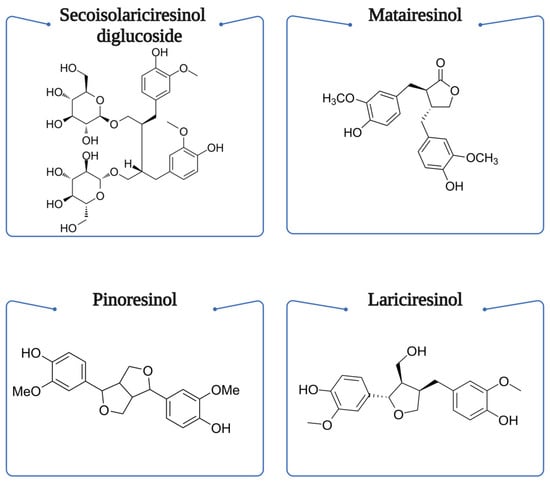 They are considered phytoestrogens, as they can stimulate the secretion of certain hormones. Structurally, they are a linkage of a 2,3-dibenzylbutane resulted after the dimerization of two cinnamic acid residues [75]. Lignans are weakly estrogenic or anti-estrogenic, found mostly in seeds such as flaxseeds and sesame seeds, and less in legumes and other plant-derived foods. Their estrogenic mechanism and other bioactivity-linked mechanisms offer lignans potential in preventing heart diseases and other chronic diseases. Most commonly in foods, lignans such as lariciresinol, matairesinol, pinoresinol, and secoisolariciresinol have been identified. Flaxseeds and sesame seeds contain exceptionally high lignan concentrations (335 mg/100 g and 373 mg/100 g, respectively), exhibiting up to 100-fold higher content compared to other dietary sources. Following ingestion, these plant lignans undergo biotransformation by gut microbiota to produce enterolignans, their bioactive metabolites [76]. They are often found in human urine or plasma and are correlated with decreasing risks of coronary heart disease [77]. The microbial metabolism of lignans is particularly interesting, as studies have shown that their bioavailability and therapeutic effects are highly dependent on gut microbiota composition. Recent research indicates that specific bacterial strains, including Bacteroides, Clostridium, and Eubacterium species, are crucial for converting plant lignans into bioactive enterolignans. The efficiency of this conversion varies significantly among individuals, with factors such as diet, antibiotic use, and overall gut health influencing the process. Additionally, the presence of dietary fiber alongside lignans may enhance their biotransformation and absorption, as demonstrated in studies with whole grain and flaxseed consumption. The enterolignans ED and EL exhibit different biological activities compared to their parent compounds, with research suggesting they may have stronger antioxidant and anti-inflammatory properties. Moreover, their structural similarity to endogenous estrogens allows them to modulate estrogen-signaling pathways, contributing to their potential protective effects against hormone-dependent cancers and cardiovascular diseases [78,79,80]. Figure 5 shows the chemical structure of four more common lignans.