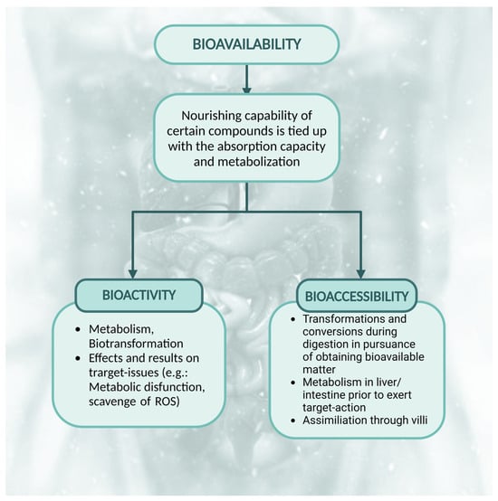Referring to bioavailability indicates the capacity of the substance/compound to be assimilated and metabolized by the host that ingested the supposedly bioavailable matter in question. Because bioavailability is tightly linked to the terms bioactivity and bioaccessibility, it is necessary to take into consideration the way the substance is transformed during transformations, conversions, and metabolization, the pathways it reaches, but also the effect it possesses on the host’s ailment (Figure 6).