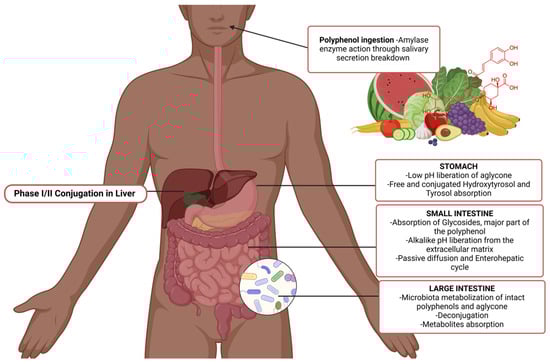 The bioaccessibility of polyphenols refers to their release from the food matrix and their subsequent modifications in the gastrointestinal (GI) tract, which affect their absorption and bioavailability. Bioavailability is influenced by factors such as the molecular structure of polyphenols, the interactions they have with other dietary components, and the mechanisms they undergo in the body. When bioavailability is studied, it is essential to first understand the resealing from the food matrix and the modifications the compound undergoes in the gastrointestinal tract. The majority of polyphenols ingested are not excreted through urine, meaning that they either have not been absorbed properly in the gut, absorbed, and excreted in the bile, or metabolized by the colon microflora or by the tissues. The molecular structure of polyphenols in their free form gives them the benefit to pass through plasmatic membranes by diffusion, unlike the case when they form complexes with other compounds, changing the way they get assimilated [111]. The availability of the compound is bound to the presence of other molecules interacting with the phenolic compound: dietary fiber reduces the absorption rate, trapping the phenols in the matrix due to their polysaccharides and the polar groups of the polyphenols; lipids increase absorption in the intestine for non-polar phenol groups (curcumin, resveratrol, xanthones, and some flavonoid aglycones); dietary proteins, on the other hand, interact with the hydroxyl groups of the polyphenols, forming hydron bonds and hydrophobic ones with the carboxyl groups of different protein chains, increasing absorption 1.5-10 times [142]; dietary carbohydrates can increase absorption of flavanols to 40%, whereas generic absorption of polyphenols is also increased due to high GI motility and action of enzymes [10,111].