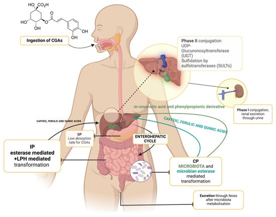 Mechanic action that happens to the ingested foodstuff, such as chewing, the crushing process, gastric motility, and abrasion between the aliments can ease the liberation and assimilation of polyphenols [111]. The stomach can only accept the free form of polyphenol for absorption. It has been proved that acidic pH does not affect the stability of polyphenol and that, depending on the complex form, the aglycon can be liberated [28]. If the polyphenol has an affinity to the mucus excreted when chewing, the mucins act as a protective layer, not allowing the gastric absorption to take place. The phenols or flavonoids found in the extracellular matrix could only be dissolved in alkaline conditions, but not in acid ones. However, they might provide local activity, protecting the GI tract of oxidizing agents’ exposure, inflammation, and intestinal diseases. Chlorogenic acids undergo hydrolysis, resulting in the release of caffeic acid and quinic acid [83,115]. It is important to note that, unlike flavonoid glycosides, chlorogenic acids are esters formed by the conjugation of caffeic acid and quinic acid. Therefore, their hydrolysis produces specific hydrolysates (caffeic acid and quinic acid) rather than aglycones [111,143].