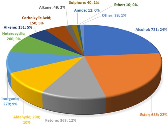 The majority of the database of chemical compounds is composed of about 24% alcohols, 22% esters, 12% ketones, 10% aldehydes, and 9% inorganic compounds. The remaining compounds include heterocyclic compounds, alkenes, carboxylic acids, alkanes, sulphures, amides, and ethers, as shown in Figure 1.